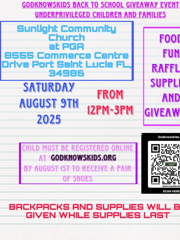 CHILDREN & PARENT/GUARDIAN MUST BE PRESENT TO RECEIVE GIVEAWAYS, BACKPACKS AND SUPPLIES ARE LIMITED.